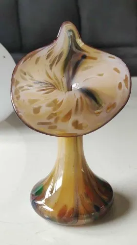 Vase Soliflore Volubilis en verre d Art soufflé Murano. Forme florale/Corolle. Moucheté polychromes sur fond ambré. Inclusion paillettes d or. Haut 21 cm
