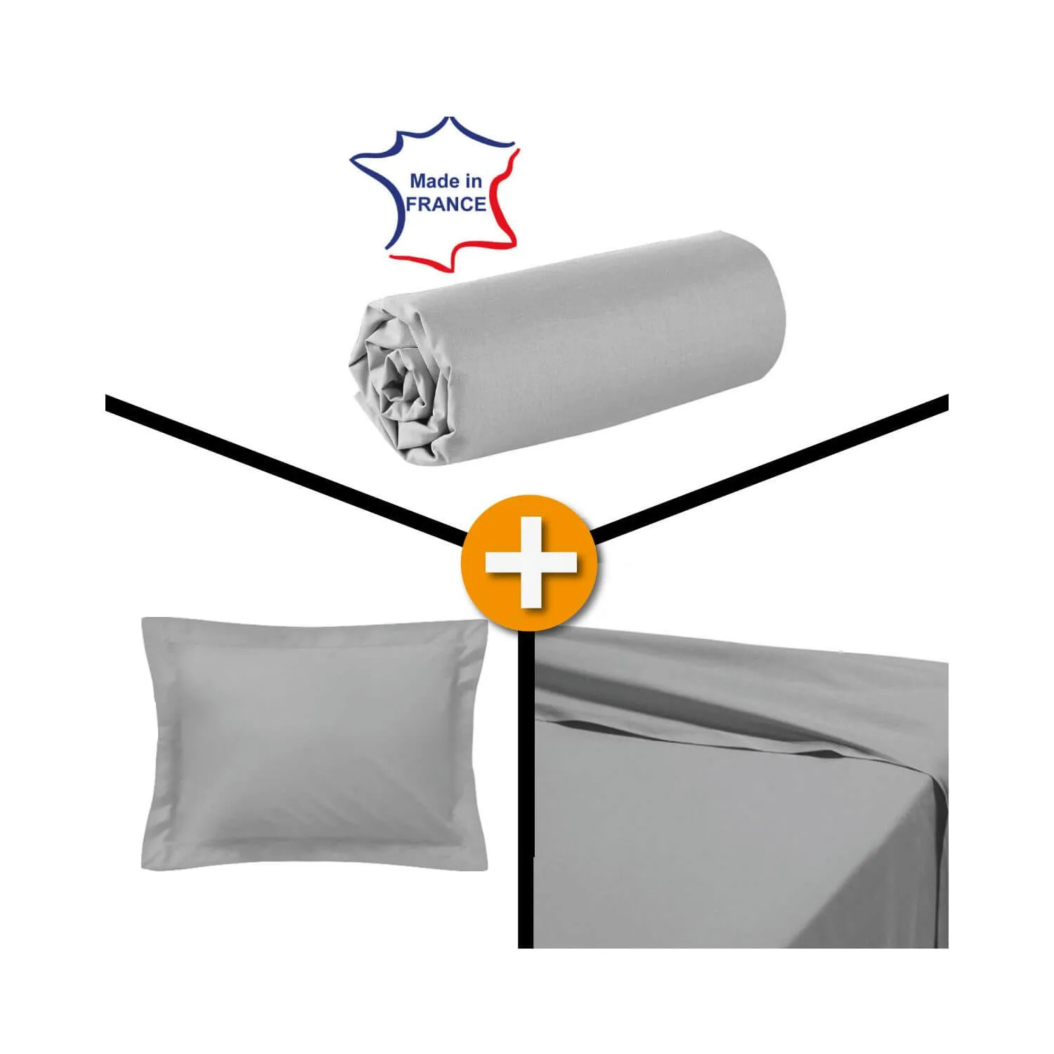 Lot : Drap housse 90 x 190 cm + Drap plat 180 x 290 cm + Taie 50 x 75 cm – Gris