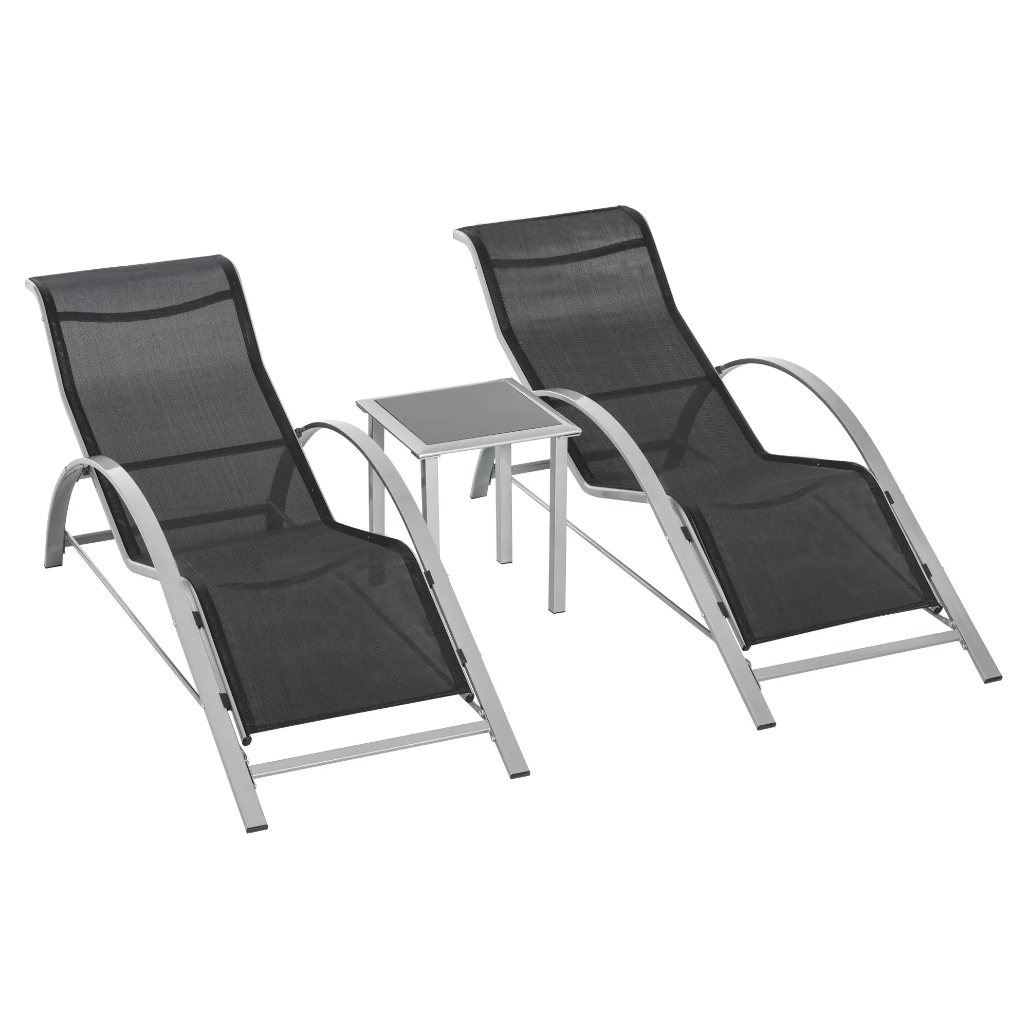 Promo !3 Piece Black Metal Frame Sun Lounger Chair Set, Garden Outdoor Sunbathing Chair with Side Table Armrest