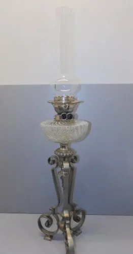 -EXCEPTIONNELLE LAMPE A PETROLE XIXe PIED BRONZE Argenté tête Messengers pat. D