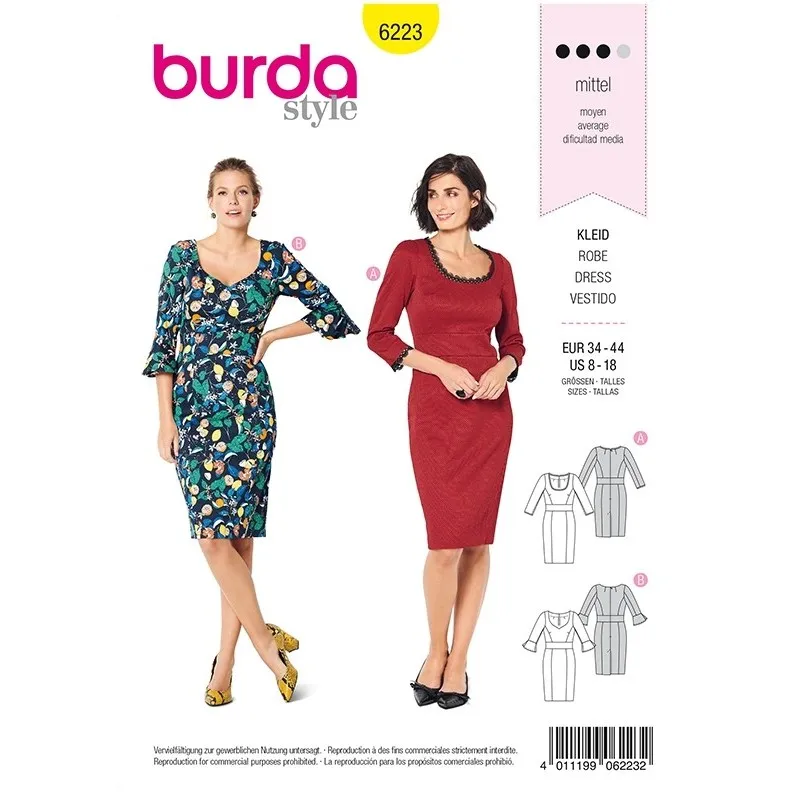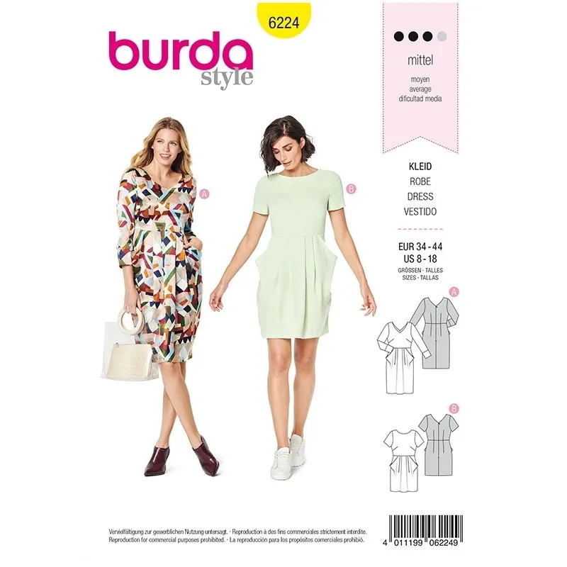 Promo !Patron Burda 6224 Robe – Encolure En V – Jupe Avec des Plis – Poches en Cornet