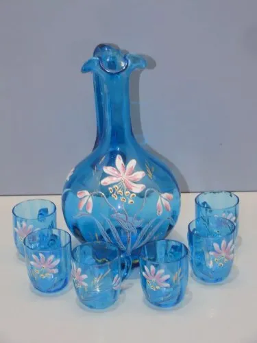 Promo !-JOLI SERVICE A LIQUEUR VERRE BLEU FLEURS EMAILLEES OBJET DE VITRINE déco D