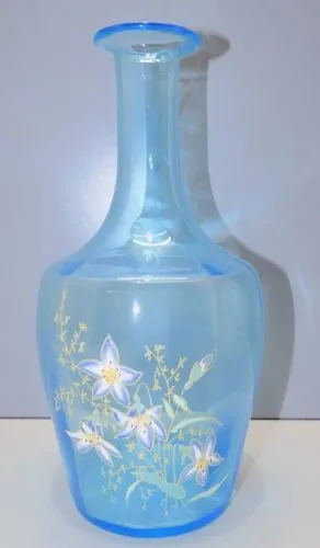 Promo !-JOLIE ANCIENNE CARAFE A LIQUEUR EN VERRE BLEU avec FLEURS EMAILLEES D