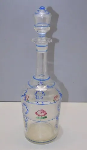 Promo !-JOLIE ANCIENNE CARAFE A LIQUEUR EN VERRE émaillée et Fleurs ROSES PEINTES D