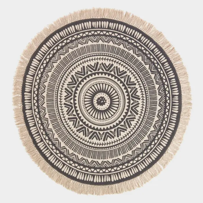 Tapis rond Mandala Noir et jaune en coton, 145 cm