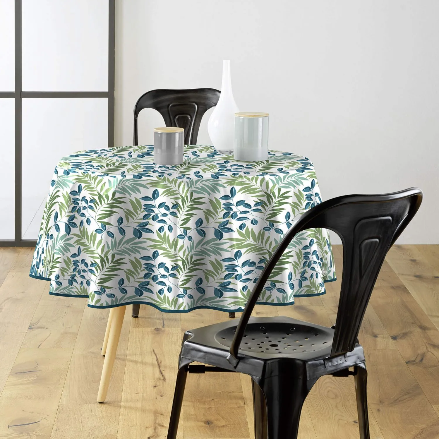 Promo !Toile cirée ronde – Diamètre 160 cm – Feuillage bleu et vert