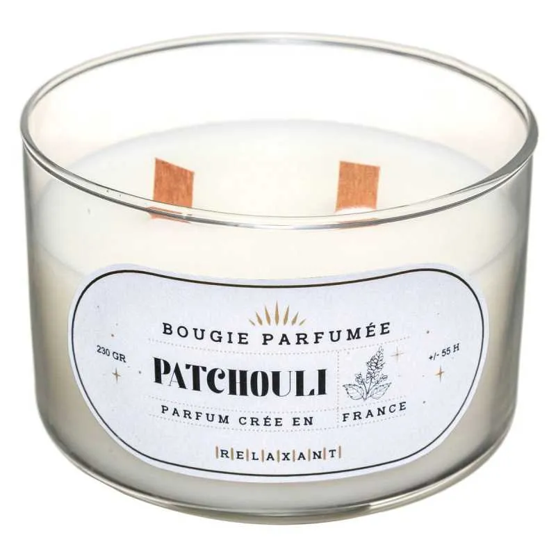 Promo !Bougie crépitante parfumée Patchouli avec mèche en bois, 230g